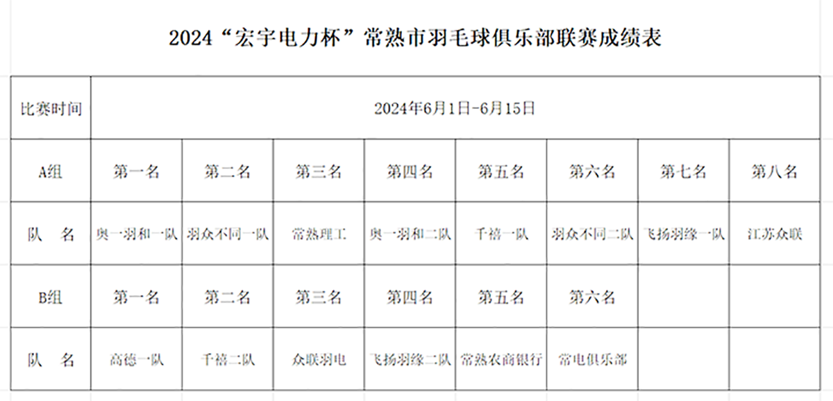 2024“宏宇电力杯”常熟市羽毛球俱乐部联赛成绩表