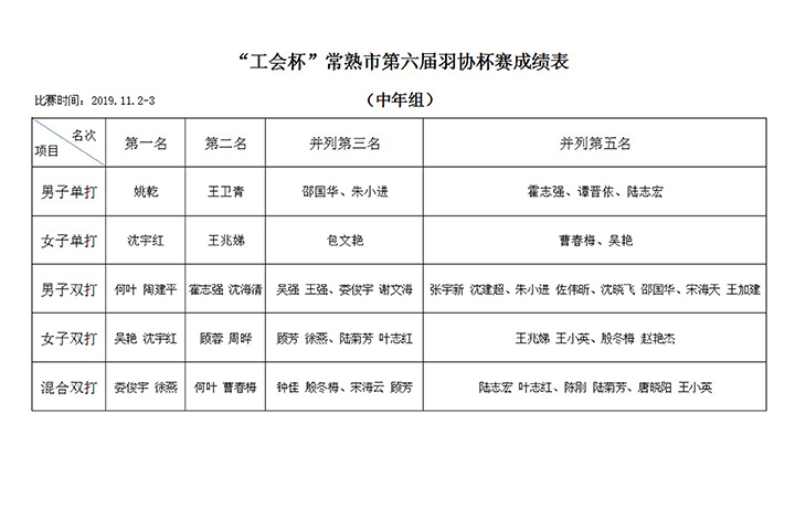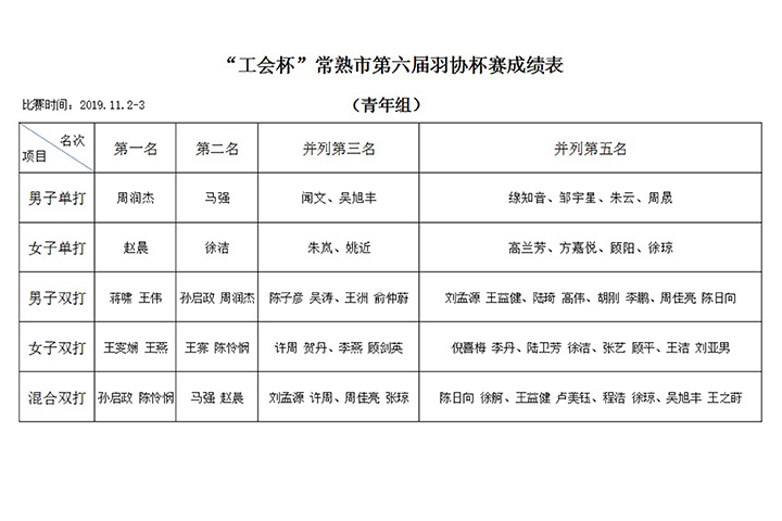 “工会杯”常熟市第七届羽协杯赛成绩公告