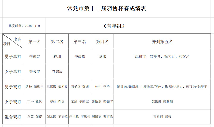 “梦之蓝M6+杯”常熟市第九届羽协杯赛成绩表